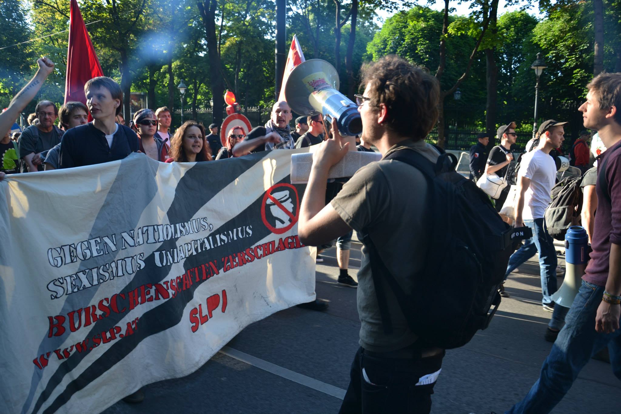 Anfang Juni fuhr ich mit einigen Mitglieder der SLP aus Salzburg und Linz nach Wien zur Demo gegen Burschenschaften und ihr „Fest der Freiheit“. Während der Demo haben wir sehr viel positive Reaktionen der PassantInnen beobachten können, viele TouristInnen konnten nicht verstehen, warum die Rechten überhaupt marschieren dürfen. Gut kam auch an, dass wir soziale Fragen aufgriffen. Nach Ende der Demonstration begaben wir uns zur nächstgelegenen U-Bahn-Station. Nach kurzer Zeit des Wartens kam jedoch nicht die U-Bahn, sondern ca. 40 PolizistInnen in voller Montur. Schon auf der Rolltreppe haben sie sich einen migrantischen Demonstranten ausgesucht und sind auf diesen mit voller Wucht losgestürmt. Sie haben ihn ohne ersichtlichen Grund gegen den Lift geknallt und gewürgt. Nach wenigen Minuten war das Zusammenschlagen eines wehrlosen Demoteilnehmers zu Ende und sie stürmten, mit ihm in der Mitte, zur anderen Seite der U-Bahnstation hinaus. Es ist eine Frechheit, dass ich mich regelrecht vor der Polizei fürchten muss, wenn ich meine Meinung äußere, indem ich an einer Demo gegen Burschis teilnehme! Die Aktion in der U-Bahn-Station war wohl die Rechtfertigung für den gewaltigen Einsatz auf der Demo. Diese ließ sich nämlich nicht von den 1.500 PolizistInnen, den Wasserwerfern oder den Polizeihubschraubern provozieren und verlief friedlich!