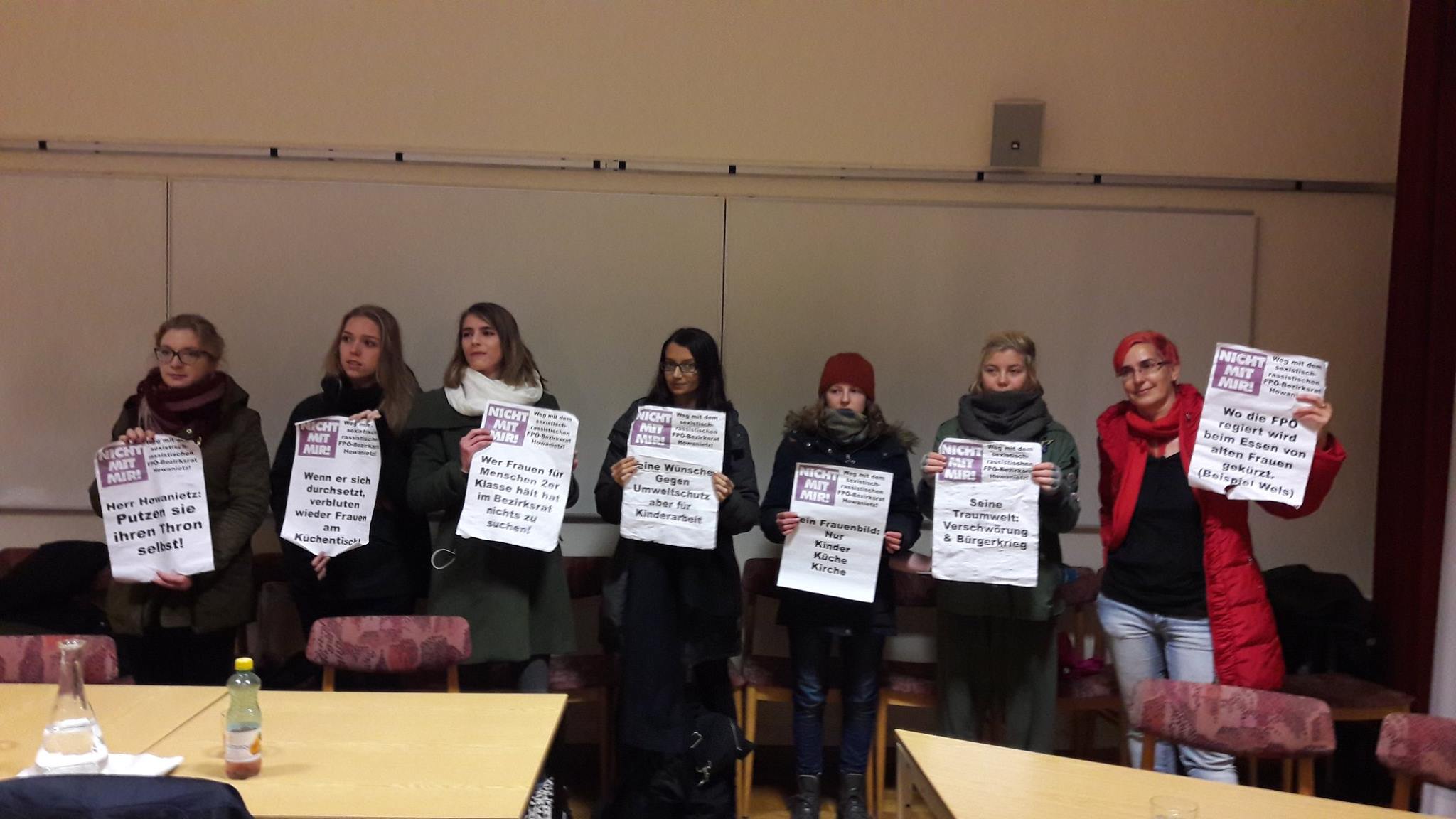 Die Initiative „Nicht mit mir!“ und die Sozialistische LinksPartei (SLP) hat gemeinsam mit Aktivistinnen von Aufbruch eine Protestaktion gegen den FPÖ-Bezirksrat Michael Howanietz, Verfasser des rechten Schmuddelwerks „Für ein freies Österreich“, organisiert. Dazu besuchten wir am Abend des 16. Novembers die Bezirksratssitzung im 20. Wiener Gemeindebezirk. Mit Ansprachen und Tafeln klärten wir dabei die Anwesenden und AnrainerInnen über den üblen Sexismus, der dieses Buch enthält, auf.