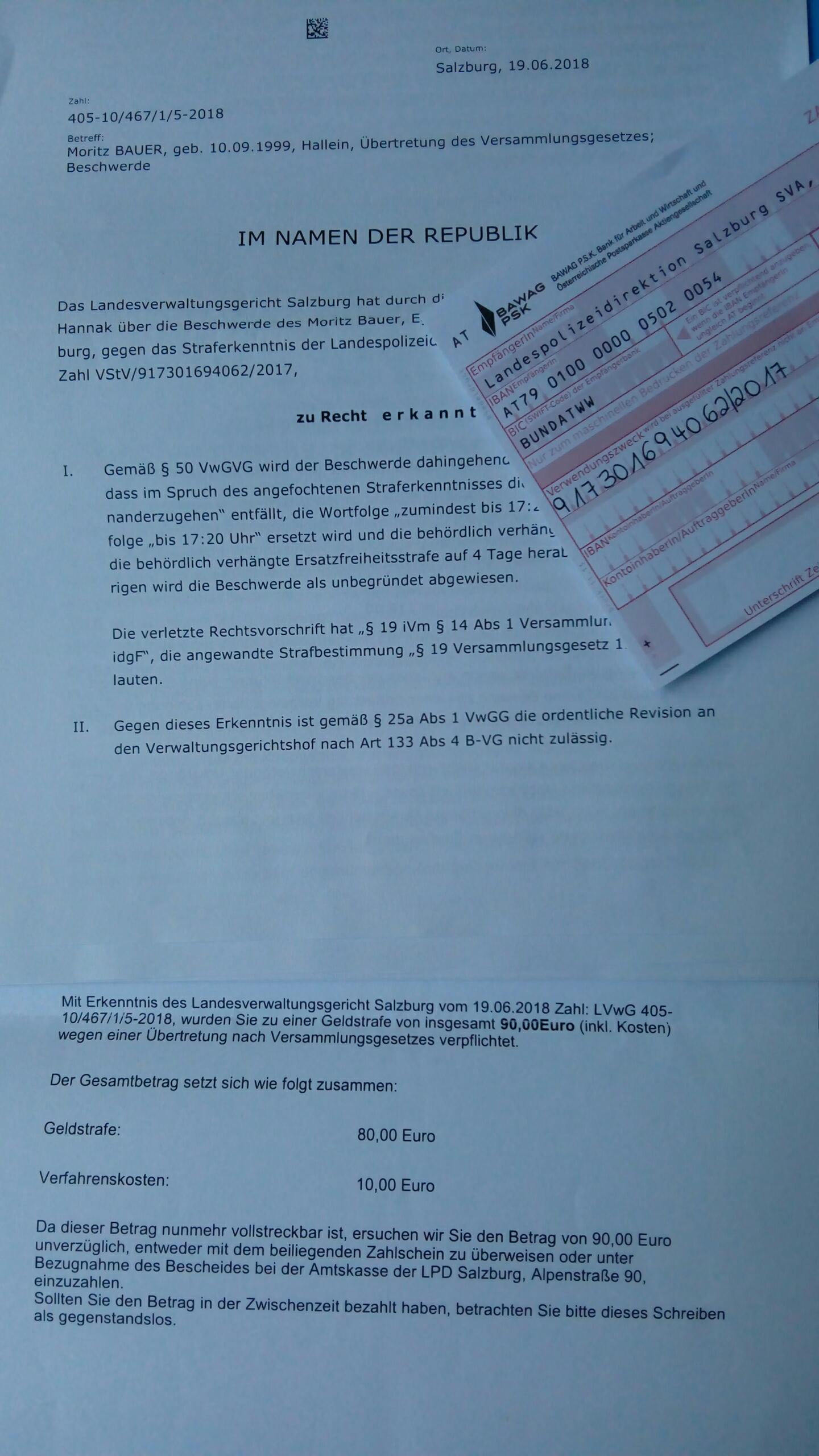 Das harte Vorgehen der Salzburger Polizei gegen alle, die sich für Frauenrechte und gegen christliche FundamentalistInnen einsetzen, ist bekannt. So auch bei einer Aktion am 27.10.2017. Trotz massiver Proteste am Vorgehen der Polizei (Stichwort Kessel) und einer teilweise mehr als bedenklichen Verhandlung muss Moritz Bauer 80.- Strafe plus 10.- Verfahrenskosten bezahlen. Für einen Zivildiener eine Menge Geld!