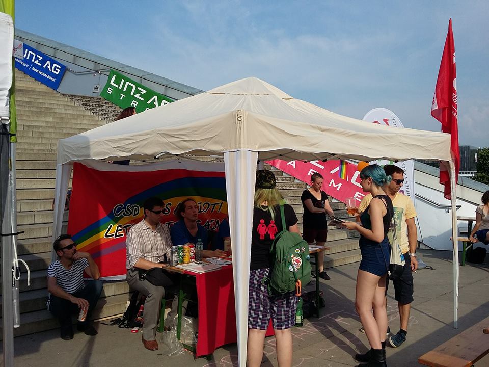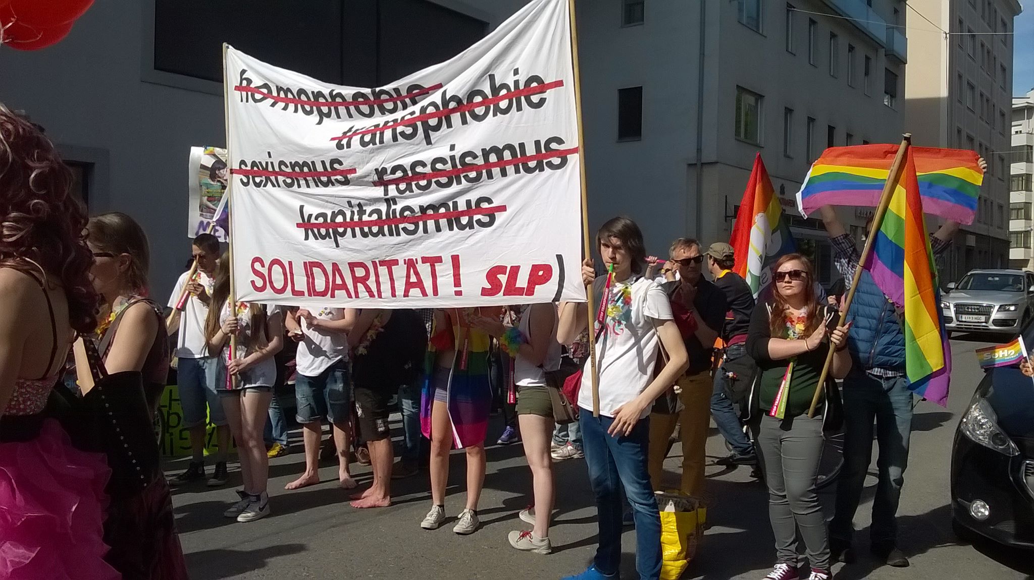 In Linz machte die SLP anlässlich des CSD eine Kampagne für eine politische LinzPride. Die SLP-Linz intervenierte auch als einzige linke Organisation mit ihrem Stand bei der alljährlichen LinzPride. Die Stimmung dort war gemütlich, dennoch führten wir politische Diskussionen und unsere Flyer kamen sehr gut an, auf der Pride sprachen auch zwei homosexuelle Männer die aus dem Irak geflüchtet waren über ihre persönliche Situation. Außerdem veranstaltete die SLP Linz einen Informationsabend über „Internationale Beispiele im Kampf gegen Homophobie“. Beim Flyern vor einer Schule, sowie der Kundgebung am Taubenmarkt thematisierten wir die Situation von Lesben, Schwulen und Transpersonen im Alltag. Viele Leute zeigten sich interessiert, jemand sagte: “In meiner Familie gibt es einen Homosexuellen, aber er kann es nicht nach außen tragen aus Angst den Arbeitsplatz zu verlieren und vor sozialer Isolation.“ Erzählungen wie diese zeigen wie wichtig der Appel eine aktive LGBT+ Bewegung aufzubauen und gewerkschaftliche Organisierung ist.
