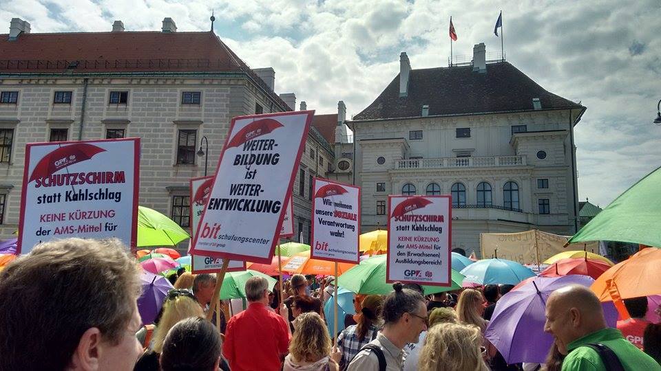 Am 2. Juni nahmen auch VertreterInnen der SLP - als Beschäftigte des Bereiches und als solidarische Menschen - an der von der GPA-djp organisierten öffentlichen Betriebsversammlung teil. Unter dem Motto "Schutzschirm statt Kahlschlag" demonstrierten ca. 1500 Beschäftigte gegen die Kürzung des AMS-Budgets auf dem Wiener Ballhausplatz. Die Kürzungen in der Erwachsenenbildung führen zu massivem Jobabbau und Standortschließungen. Bereits 500 TrainerInnen haben den Job verloren, betroffen sind bis zu 1.500. Wieder einmal sollen die Beschäftigten in Folge der Sparmaßnahmen der Regierung ihren Job verlieren.