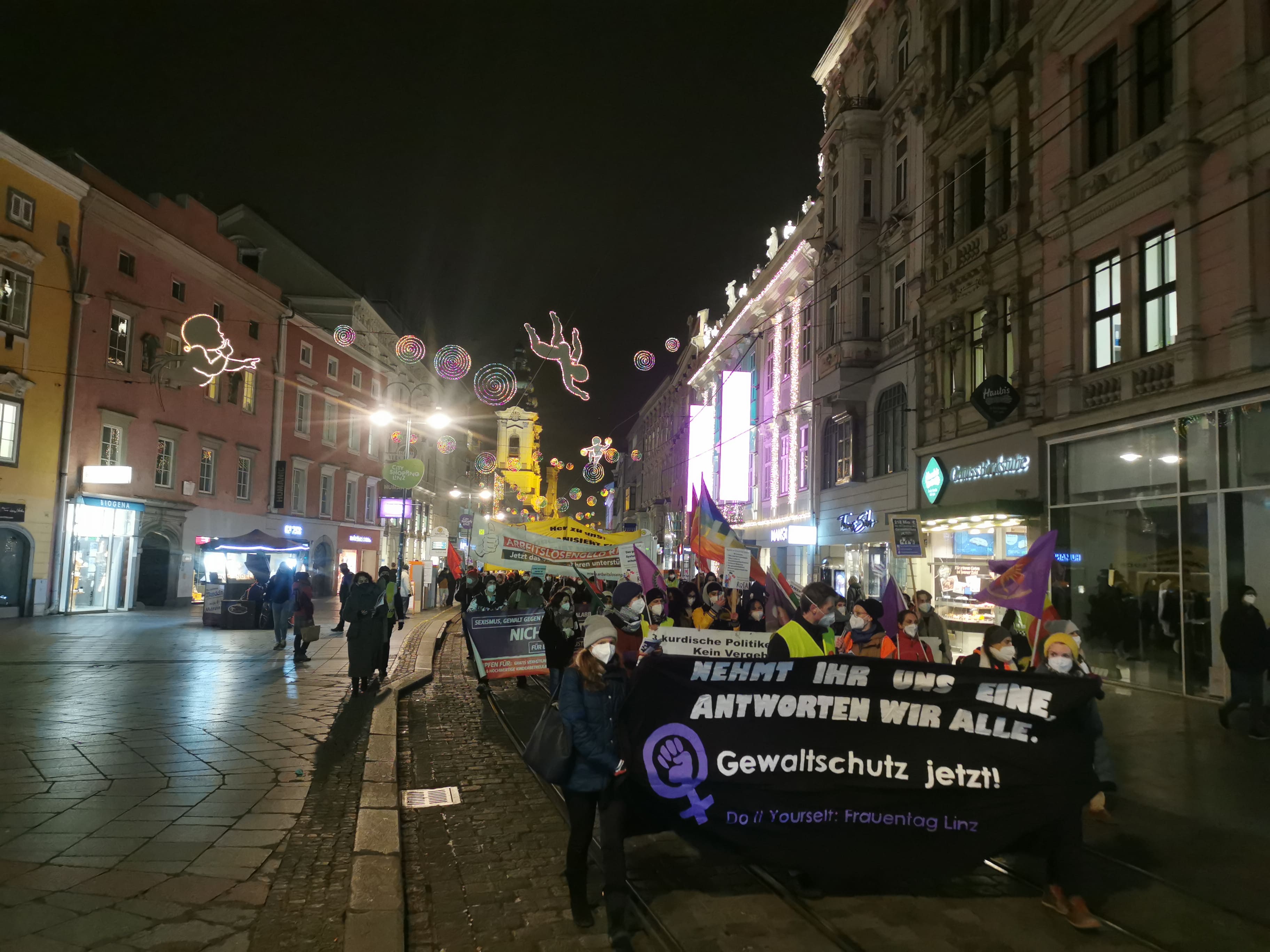 In Linz hat das Bündnis "Do it Yourself Frauentag Linz" eine sehr kämpferische Demonstration mit über 100 Teilnehmer*innen organisiert, viele davon Jugendliche und Schüler*innen die zum ersten Mal auf einer Demonstration waren. Eine Teilnehmerin hat die Dringlichkeit einer Bewegung gegen Gewalt an Frauen formuliert mit: "Es ist als wären wir machtlos gegen diese Femizide, deshalb musste ich diesmal auf die Straße kommen". Im Aufruf der Demonstration standen konkrete Forderungen wie die nach 228 Millionen für Gewaltschutz sofort, kostenloser, flächendeckende Kinderbetreuung und höhere Löhne in frauendominierten Branchen im Zentrum. Für uns ist der Kampf gegen Sexismus und Gewalt untrennbar verbunden mit den Protesten die wir in den vergangenen Monaten in frauendominierten Branchen gesehen haben (Pflege, Elementarpädagog*innen, Bildungsbereich).