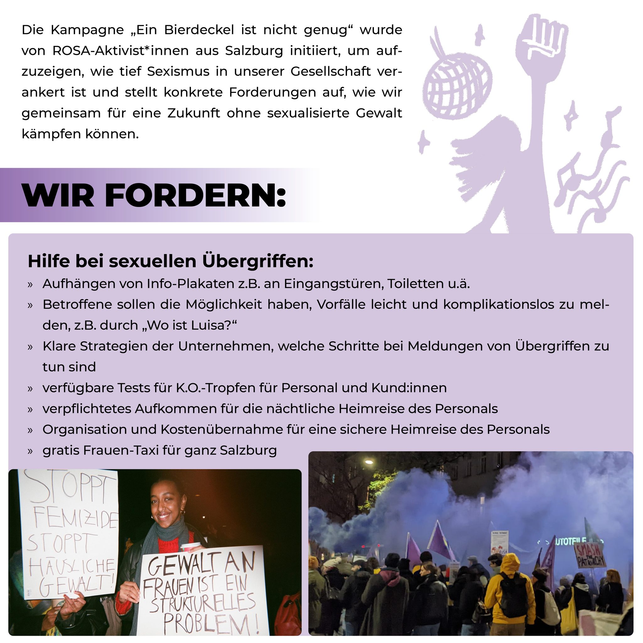 „Durch die schlechte Bezahlung in der Nachtgastronomie sind die Beschäftigten auf Trinkgeld angewiesen und können so lästige Gäste nicht einfach verweisen. Dies darf nicht länger toleriert werden...Die Kampagne „Ein Bierdeckel ist nicht genug“ wurde von ROSA initiiert, um aufzuzeigen, wie tief Sexismus in unserer Gesellschaft verankert ist und stellt konkrete Forderungen auf, wie wir gemeinsam für eine Zukunft ohne sexualisierte Gewalt kämpfen können.“