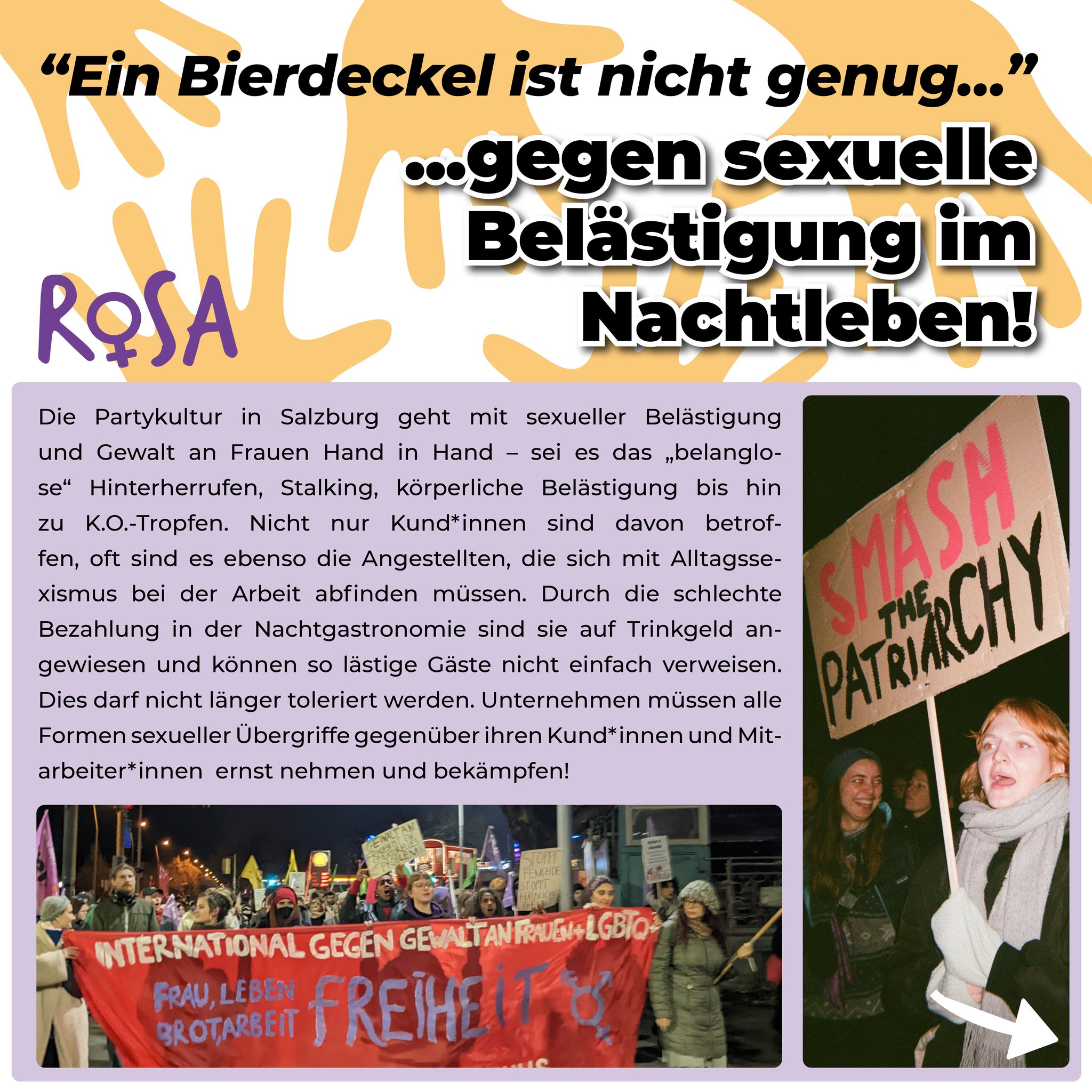 Seit Herbst 2022 finden auch in Salzburg regelmäßig ROSA-Treffen und Aktionen statt. In den Treffen wurden aktuelle Themen wie Queerfeindlichkeit aber auch die Geschichte der schwarzen Bürger*innenrechtsbewegung in den USA, und wichtige feministische Forderungen für unsere politische Arbeit diskutiert. Wir organisierten eine Protest-Kundgebung gegen den „Marsch fürs Leben“ von frauenfeindlichen Abtreibungsgegner*innen, bei der junge ROSA-Aktivist*innen Reden hielten und Diskussionen führten. Im Frühjahr 2023 veröffentlichten wir schließlich unsere Kampagne „Ein Bierdeckel ist nicht genug“, welche ihren Fokus auf sexualisierte Gewalt im Nachtleben in Salzburg setzt.