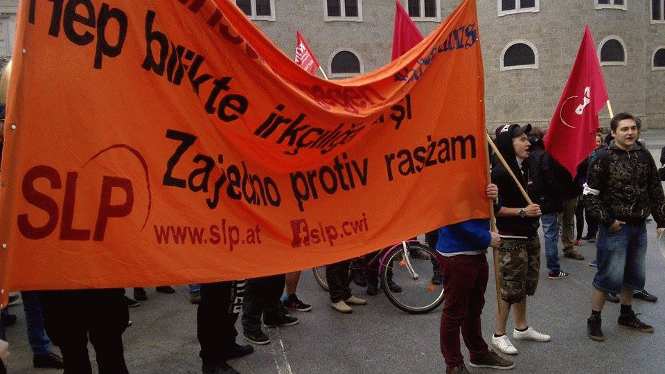 Am 14.5. waren die FPÖ-Chefhetzer Strache und Vilimsky mal wieder in Salzburg um, anlässlich der EU-Wahl ihre menschenverachtenden Parolen zu verbreiten. Auf Initiative der SLP als Teil der Plattform gegen Rechts, kamen hunderte AntifaschistInnen zusammen, um dagegen zu protestieren. Der Protest bekam zusätzliche Bedeutung, da in der Nacht vor der Demo das Mahnmal für die Opfer der NS-Euthanasie (der Demotreffpunkt) von Neonazis zerstört wurde. Lukas Kastner von der SLP betonte in seiner Rede die Notwendigkeit, sowohl Nazivandalismus als auch die rassistische Hetze der FPÖ und ihre sozialen Wurzeln zu bekämpfen.