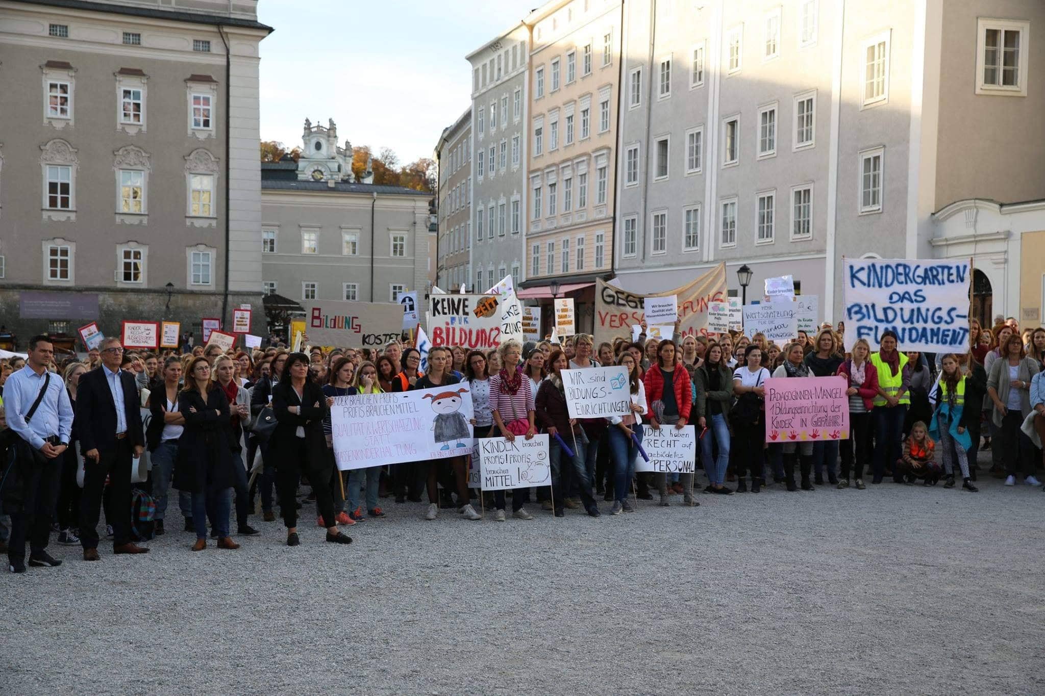 Eine Mitarbeiterin der MA10 in Wien erklärt sich nicht nur solidarisch, sondern erklärt auch, warum der Protest richtig und notwendig war: „Während die FPÖVP-Regierung mit dem Kopftuchverbot ihre rassistische Politik in die Kindergärten bringt, winkt der Salzburger Landtag einen neuen Gesetzesentwurf den Kindergarten betreffend durch: Grundsätzlich haben Pädagog*innen in Salzburg, zusätzlich zu ihrem Urlaub, 12 Schließtage, die bisher im Gesetz verankert waren. Der Salzburger Landtag beschloss jetzt aber, diese von 12 auf nur sechs Schließtage im Jahr zu reduzieren. Dabei wird aber das Gehalt der Kindergärtner*innen, das ohnehin für das Ausmaß der Arbeit sehr gering ist, nicht erhöht. Das bedeutet also sechs unbezahlte Arbeitstage mehr und somit wiederum weniger dringend gebrauchte Freizeit und Regeneration! Genau aus diesem Grund versammelten sich Anfang November rund 1.200 Pädagoginnen und Pädagogen aus der ganzen Stadt um gegen diesen neuen Gesetzesentwurf und für bessere Arbeitsbedingungen zu demonstrieren. Zusammengefasst bringt das neue Gesetz also nicht nur schlechtere Arbeitsbedingungen für Berufseinsteiger*innen, sondern einen Gehaltsverlust von 34.000 Euro brutto, berechnet auf 40 Jahre, mit sich. Als Pädagogin in Wien solidarisiere ich mich zu 100% mit meinen Kolleg*innen in Salzburg und fordere deshalb die absolute Rücknahme dieses Gesetzes. Um die Qualität zu erhöhen brauchen wir keinen Rassismus und Kürzungen im Kindergarten, sondern bessere Rahmenbedingungen. Nicht nur in Salzburg, sondern in ganz Österreich. Das heißt: Änderung des Betreuungsschlüssels! Mehr Personal! Mehr Gehalt! Größere Gruppenräume! Erst so kann die Bildung und Entwicklung der Kleinsten unserer Gesellschaft ernsthaft verbessert werden!“