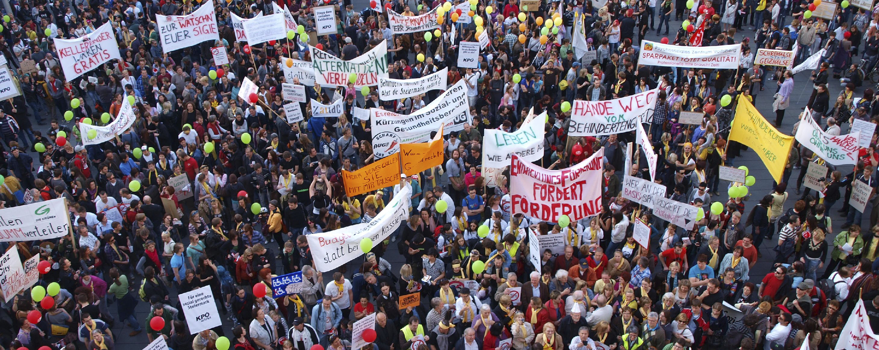 Durch Unterschriftenaktionen und Proteste auf der Straße kann der Druck auf die politisch Verantwortlichen erhöht werden. Die letzten Jahre zeigen: Wo es Angebote für Widerstand gibt, werden diese genutzt. Viele unterschrieben gegen die Kürzung der Wohnbeihilfe in der Steiermark und hunderte beteiligten sich dann im Oktober an einer Demonstration. Als die Basisinitiativen CaRevolution/Care Revolution 2015 Proteste und Demonstrationen in Salzburg und Wien organisierten, folgten hunderte Beschäftigte dem Aufruf, um gegen das Kaputtsparen im Gesundheitssystem zu demonstrieren.