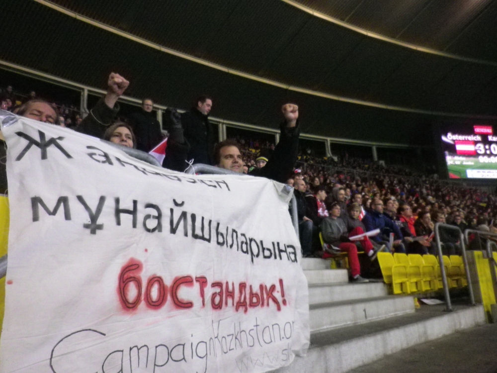 Die SLP erklärt sich mit diesen ArbeiterInnen solidarisch. AktivistInnen der CampaignKazachstan und zeigte das auch im nahezu ausverkauften Ernst-Happel-Stadion in Wien. Es wurde sowohl während der kasachischen Hymne, als auch während der zweiten Spielhälfte ein weithin sichtbares Transparent in kyrillischer Schrift gezeigt, auf dem da stand: "Жаңаөзен мұнайшыларына - бостандық!" (Freiheit für die Ölarbeiter von Shanaozen) hochgehalten. Ähnliche Proteste von AktivistInnen der Campaign Kasachstan gab es bereits in Belgien und Schweden.