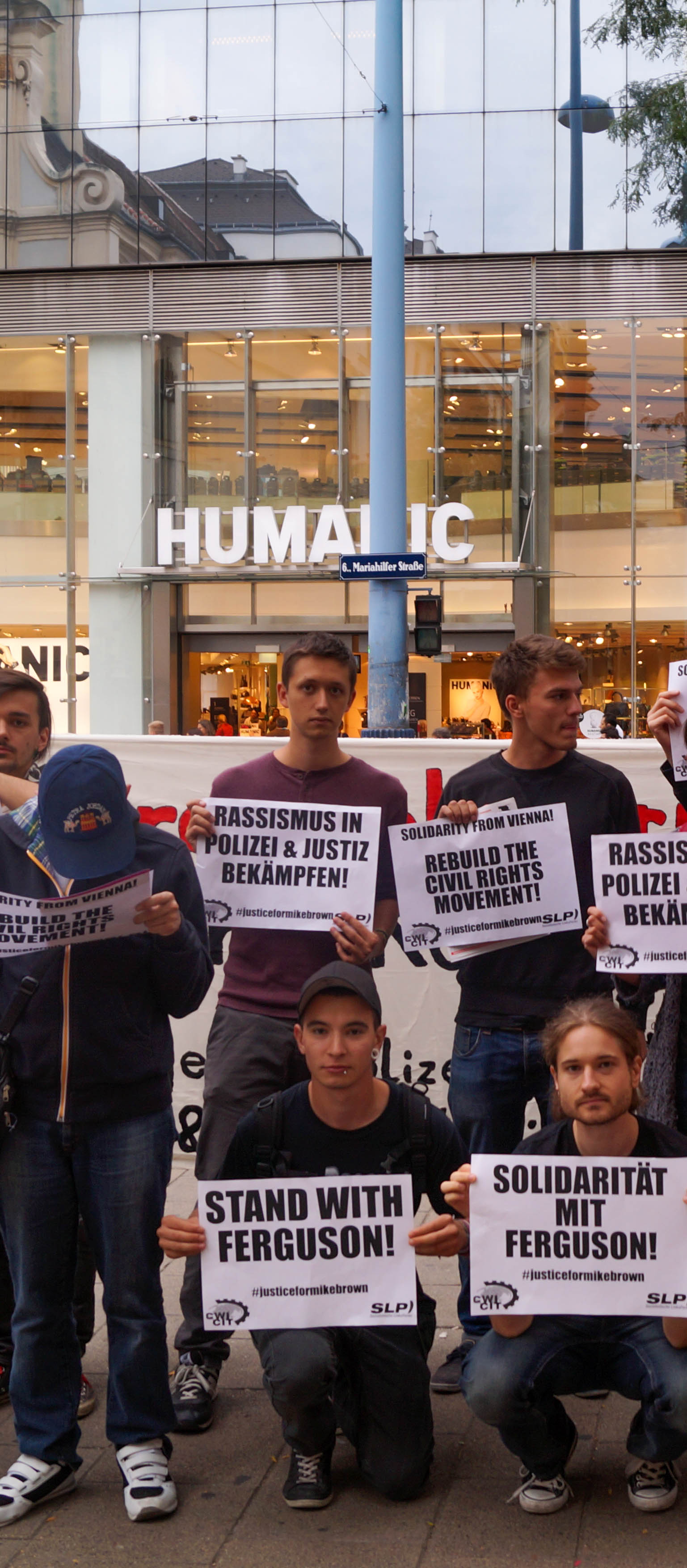 Die SLP hielt in Wien am 20.8. eine Kundgebung in Solidarität mit der Rebellion in Ferguson/USA ab. Seit der Ermordung des jungen Michael Brown gehen Menschen gegen die rassistische Polizeigewalt und die katastrophale soziale Lage auf die Straße. Die örtliche Polizei riegelte die Stadt ab. Schon von Beginn an wird massive Gewalt eingesetzt um den Aufbegehrenden zu zeigen: Stay in line („Nicht aufmucken“).
