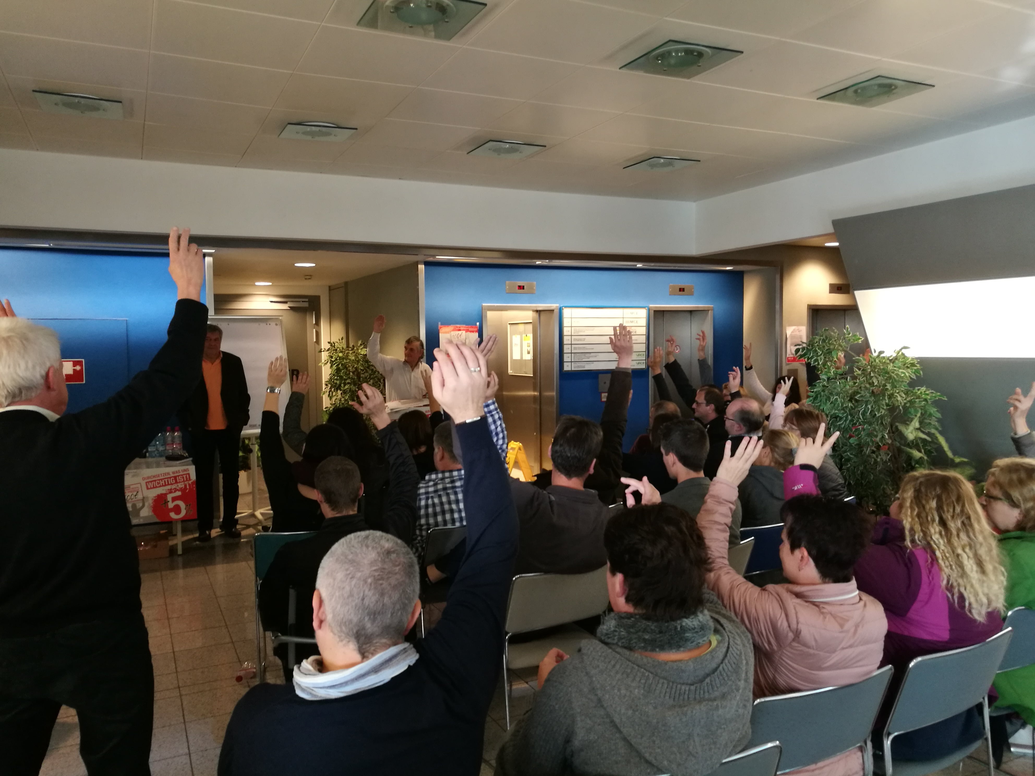 „Solidarität – gemeinsam sind wir stark“, so heißt nicht nur der Name unserer Betriebsratsliste bei Bilfinger Shared Services Österreich (BSSÖ). Sondern das war auch das Motto der Betriebsversammlung, die wir gemeinsam mit der MCE (einer früheren Schwestergesellschaft, die mittlerweile an den Baukonzern HABAU verkauft wurde, aber immer noch im selben Bürogebäude untergebracht ist) am 14.11.2018 anlässlich des Scheiterns der KV-Verhandlungen in der Metalltechnischen Industrie und der anschließenden Warnstreiks in Hunderten Industriebetrieben der Metallindustrie abgehalten haben.