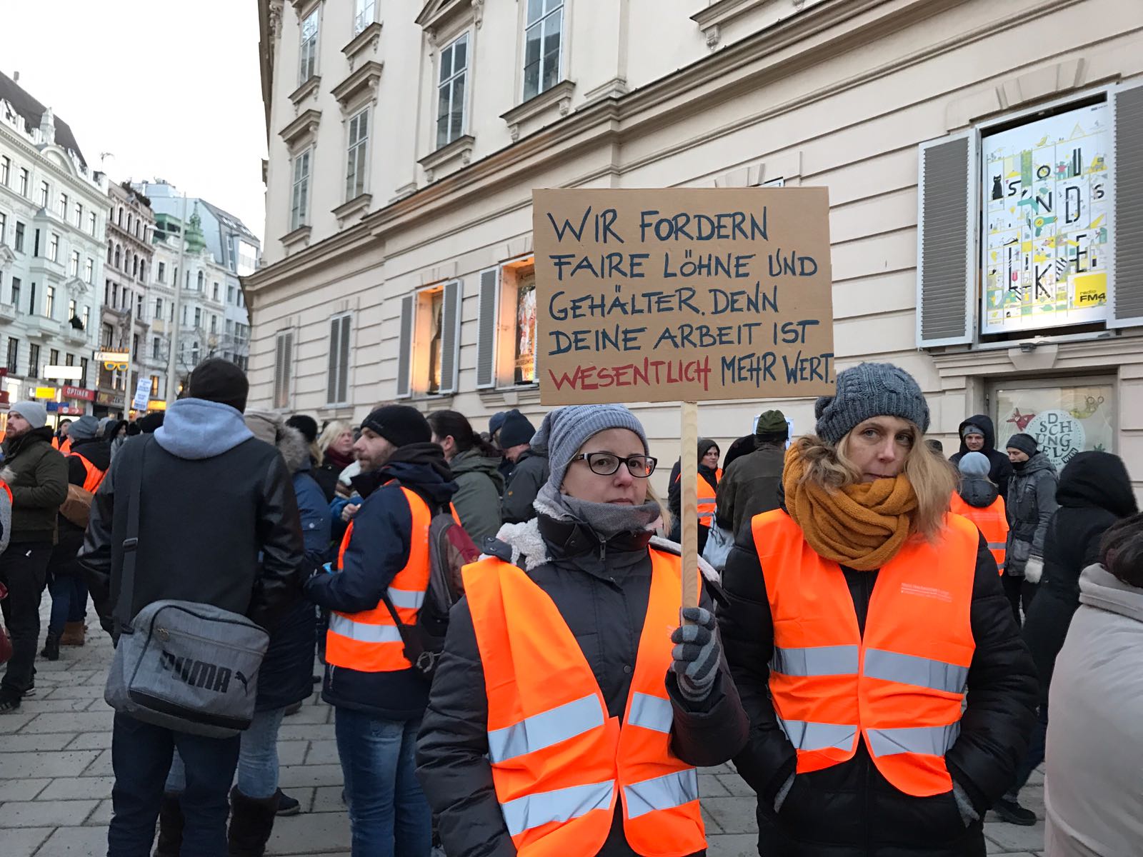 Am Montag den 16.1. protestierten hunderte Beschäftigte des Wiener Sozialbereichs für höhere Löhne und Arbeitszeitverkürzung bei den SWÖ-Kollektivvertragsverhandlungen (https://www.facebook.com/WienTV.org/videos/1200675253302580/?__mref=message_bubble). Die Gewerkschaft GPA-djp hatte zum Protest gerufen, KollegInnen aus u.a. den Bereichen Flüchtlings-, Behinderten- und Kinderbetreuung waren gekommen. Viele wussten allerdings gar nichts von der Demonstration. Der Leidensdruck im Sozialbereich ist enorm. Überarbeitung und Unterbezahlung gehören zur tragischen Normalität. Viele KollegInnen waren dann auch von der Demonstration selbst enttäuscht. Es gab kein Material, um die zahlreichen PassantInnen auf der Mariahilferstraße zu informieren oder gar einzuladen sich zu beteiligen. Die Demonstration endete nach einer sehr kurzen Abschlusskundgebung ohne das gesagt wurde, was die nächsten Schritte sind. KollegInnen aus den Betrieben kamen nicht zu Wort.