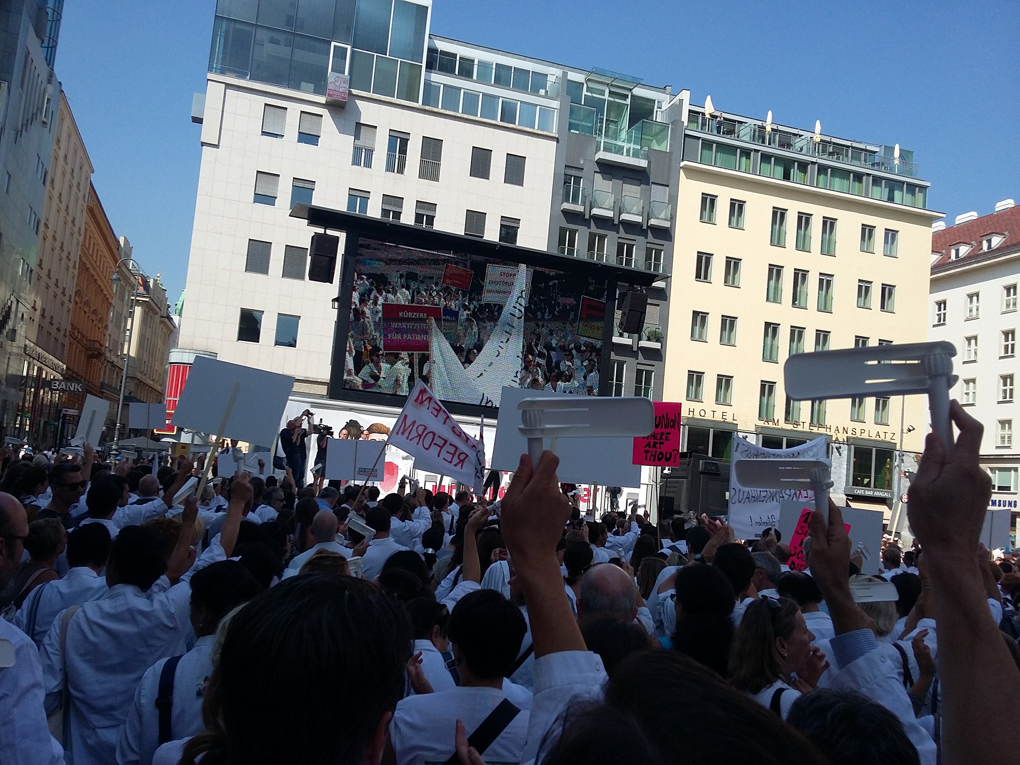 Am Montag den 12. September kam es zum Streik der Wiener SpitalsärztInnen, konkret jener, die im KAV (Krankenanstaltenverbund der Gemeinde Wien) angestellt sind. Rund 2.000 TeilnehmerInnen waren zur Demonstration vom Stubentor zum Stephansplatz gekommen. Die Teilnahme war beachtlich, der Gegenwind ebenso. Und die Gewerkschaft kann noch einiges lernen.