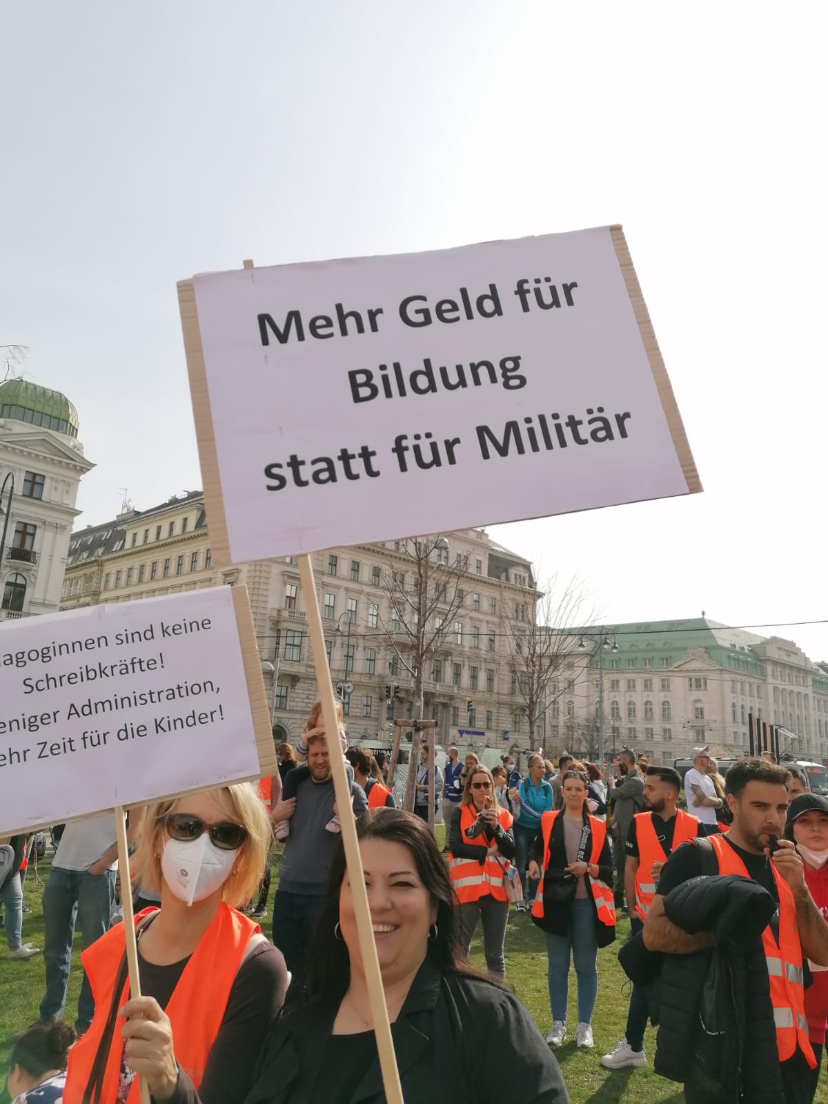 Auch die Verbindung zu Krieg und Aufrüstung wurde von den Kolleg*innen gezogen, wie etwa ein Schild ausdrückte, auf dem stand: “Mehr Geld für Bildung statt für Militär”. Eine andere Kollegin forderte in ihrer Rede 1 % des BIP für Kindergärten - und konterte damit direkt Nehammers Ankündigung, das Budget des Bundesheers auf denselben Prozentsatz zu erhöhen. Eine andere Kolleg*in berichtete auf der Bühne davon, dass Elementarpädagog*innen auch zunehmend mit kriegs- und fluchtbedingten Traumatisierungen bei Kindern umgehen müssen - und dass es dafür ausreichend Ressourcen und Unterstützungspersonal, gerade jetzt, braucht.