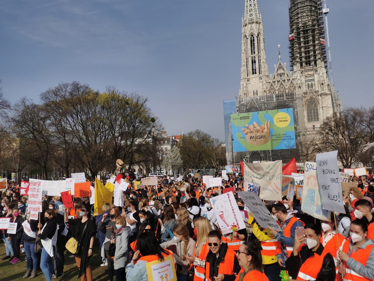 Denn bereits im Oktober 2021 hatte es eine Großmobilisierung gegeben, doch die Zustände in den Kindergärten und anderen Einrichtungen sind um nichts besser geworden. Schon vor der Pandemie litten die Kolleg*innen unter Niedriglöhnen; viele Kolleg*innen trugen selbstgemachte Schilder, auf denen “Ich kann gar nicht so schlecht arbeiten, wie ich bezahlt werde” stand und forderten massive Gehaltserhöhungen. Das zweite große Thema ist der Personalmangel auf allen Ebenen; unzählige Transparente und Schilder forderten kleinere Gruppen und bessere Betreuungsschlüssel. Zur Berufskrankheit Burnout kam dann noch Corona dazu: Für Elementarpädagog*innen gab es keine Lockdowns, kein Homeoffice und kein Distance-Learning - Sie mussten unter schwierigsten Bedingungen durcharbeiten und bekamen dafür nichts von der Politik, außer zynischem Applaus. In Wien richteten Kolleg*innen ihre Wut und ihre Forderungen auch direkt an die Verantwortlichen: “Ludwig, her mit den Millionen für den Kindergarten!” und “Bildungsstadtrat Wiederkehr macht uns die Arbeit schwer” war auf Schildern zu lesen.