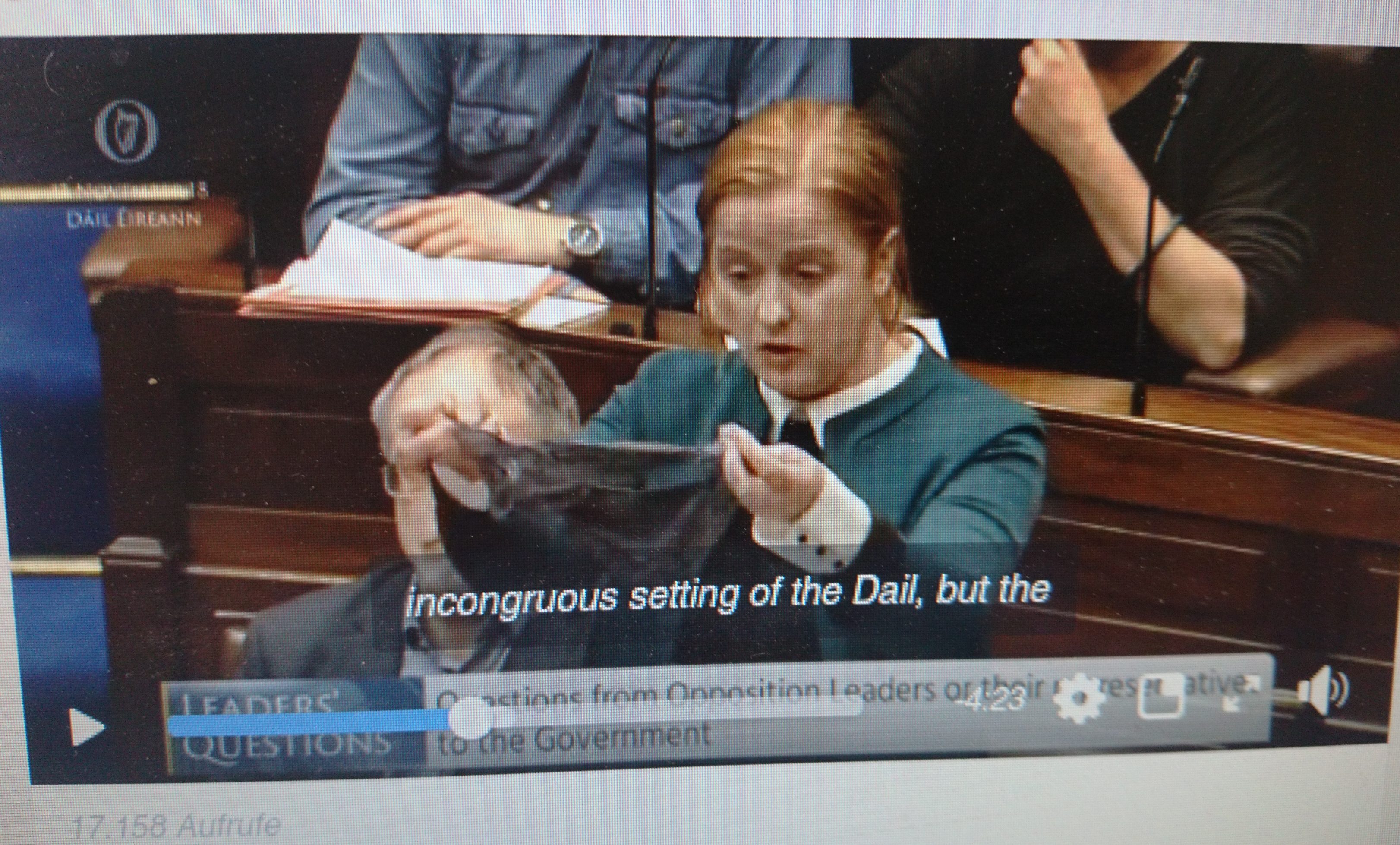 Ruth Coppinger, Abgeordnete von Solidarity und Mitglied der Sozialistischen Partei, brachte diese Stimmung in den Dáil (Parlament), als sie Leo Varadkar, den Premierminister, befragte. Sie forderte von der Regierung Maßnahmen gegen „Victim Blaming“ vor Gericht, indem sie einen String während ihrer Rede im Dáil hochhielt. Dies ist wahrscheinlich eine Premiere in der Geschichte des Dáil, und die Kameras schwenkten schnell weg von dem "provozierenden Gegenstand". Doch wie Ruth betonte, wenn so etwas im Parlament unangebracht sein sollte, ist es umso unangebrachter, dass Unterwäsche vor Gericht als Beweis gegen eine Frau verwendet wird.
