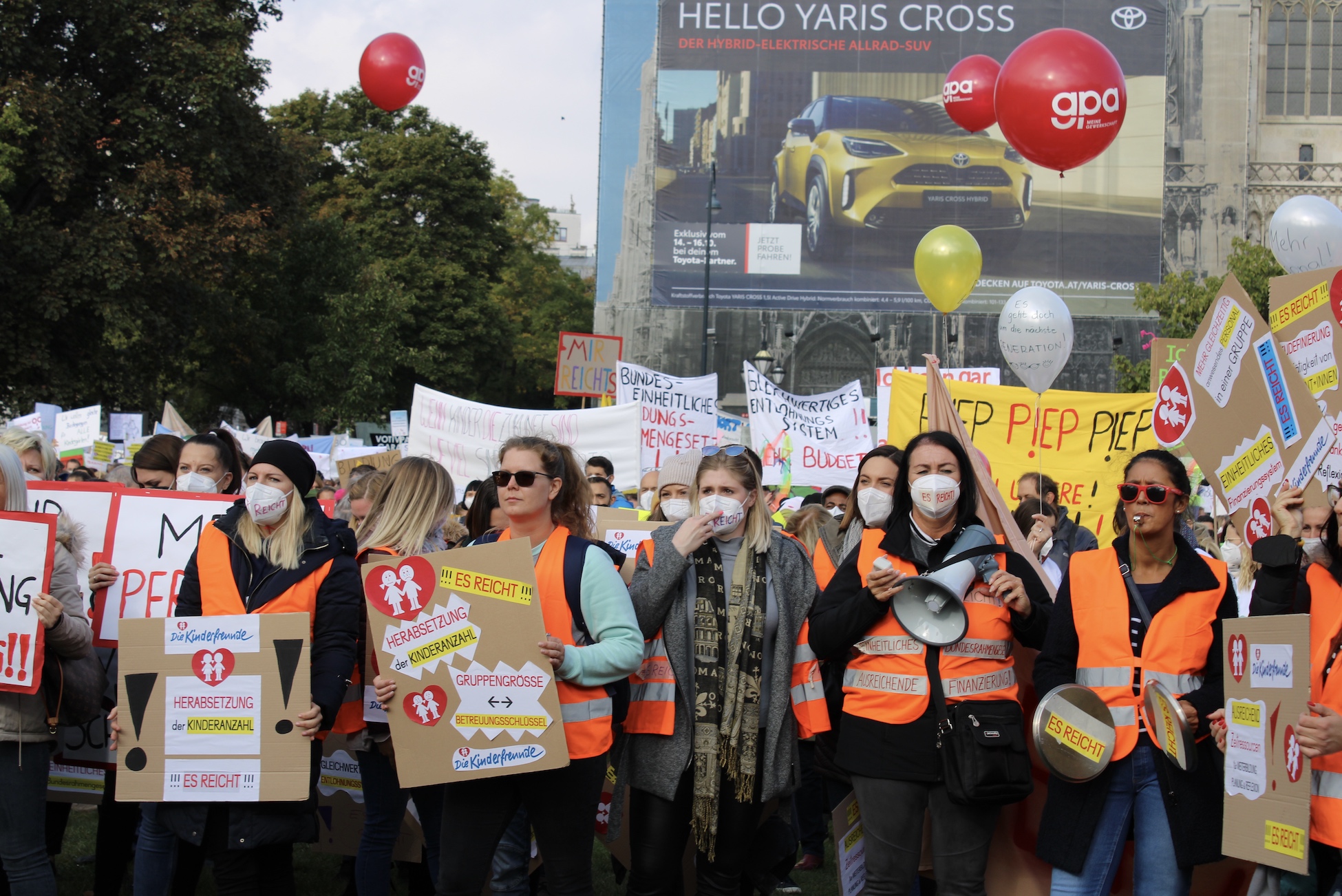 Immer wieder kommt es zu Pflegeprotesten. So stellten sich zum Beispiel Krankenhausbeschäftigte bei einer landesweiten Aktion während der Arbeitszeit fünf Minuten vor die Tür, um zu signalisieren, dass es in der Pflege bereits „5 nach 12“ bzw. mittlerweile „15 nach 12“ ist. Auch in der Elementarpädagogik tut sich einiges. Im Oktober gingen knapp 8.000 Elementarpädagog*innen in Wien an zwei Aktionstagen, einem der öffentlichen und einem der privaten Träger, auf die Straße. Sie forderten u.a. kleinere Gruppen und mehr Geld. Es kam zu den ersten Arbeitsniederlegungen von Beschäftigten seit dem Ausbruch der Pandemie. Am 29.03. ist der nächste große Aktionstag geplant. Auch in Deutschland finden bundesweite Proteste und Streiks der Erzieher*innen statt, für deren Höhepunkt der 8. März, der Internationale Frauentag, als Streiktag geplant ist. Sie fordern v.a., dass ihre Tätigkeiten höher bewertet und damit besser bezahlt werden. Davon wären 900.000 Beschäftigte betroffen. Um die Bewegung zu stärken, werden von Gewerkschaften und feministischen Gruppen in einigen Städten bereits Solidaritätsbündnisse in Nachbarschaften aufgebaut. ROSA unterstützte diese Kämpfe und wird auch weiterhin bei den Protesten dabei sein.