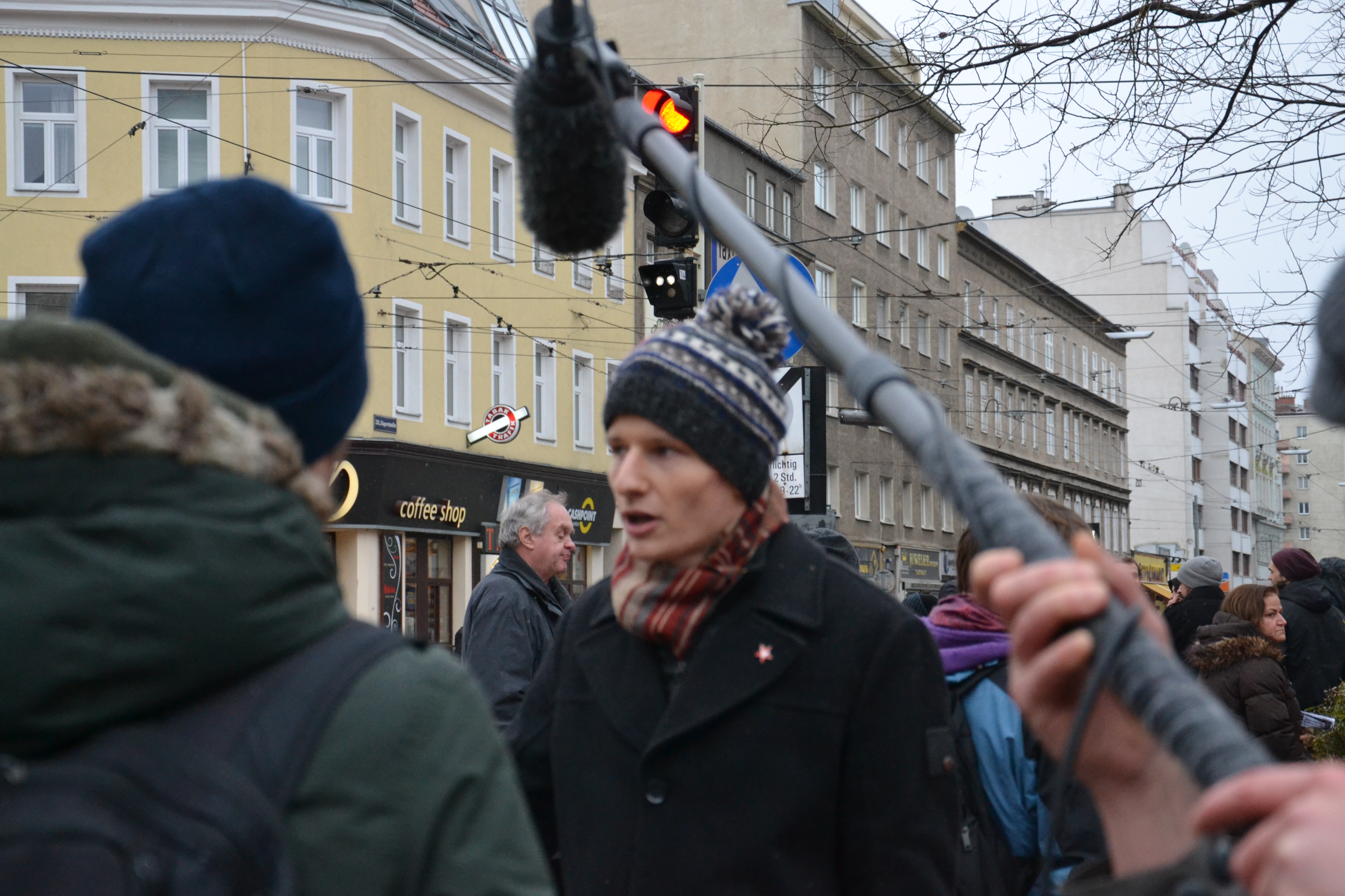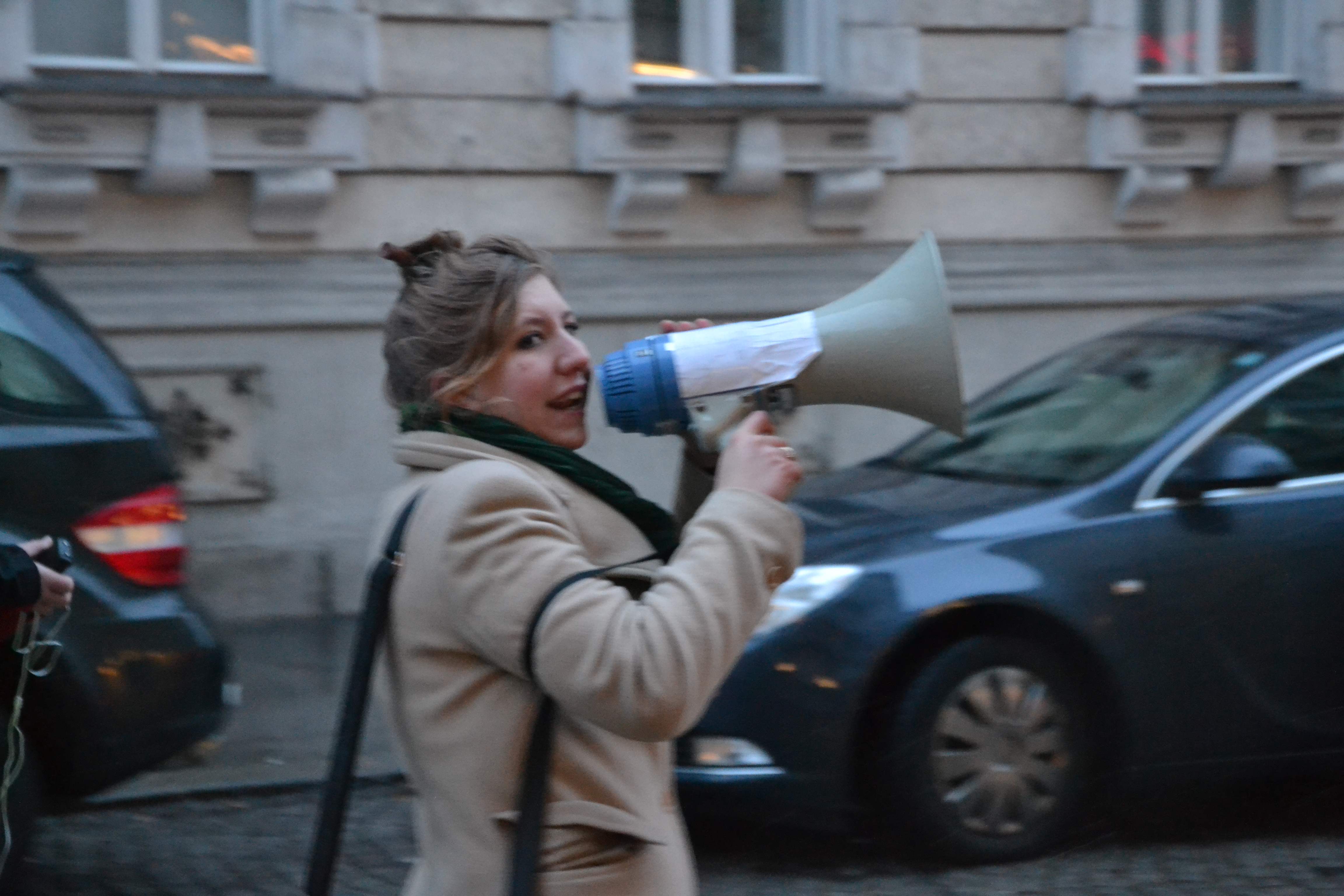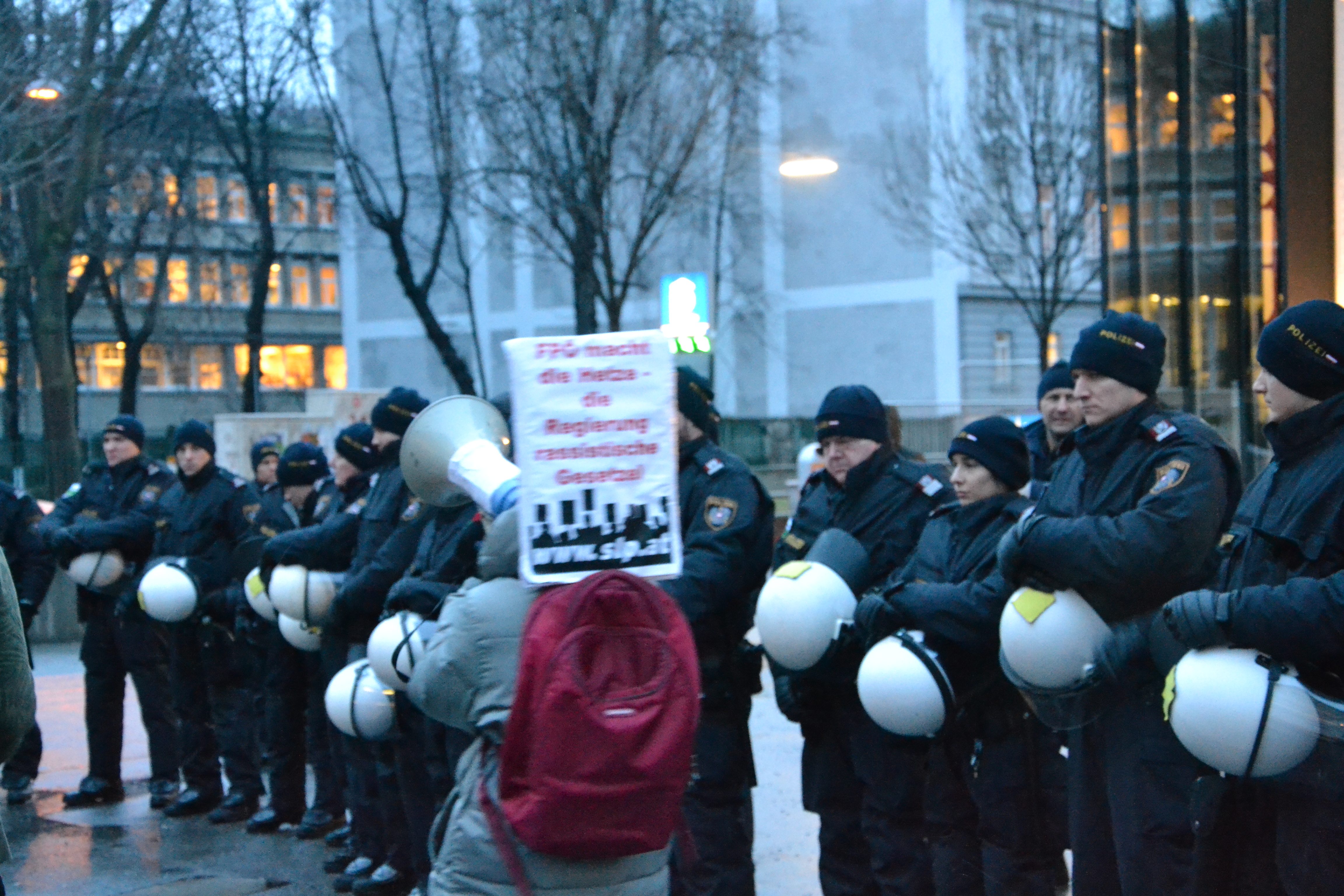 Doch auch diese absolut friedliche Demonstration der SLP wurde rasch von massiver Polizeirepression angegriffen. Am Bauernfeldplatz tauchten plötzlich 60-80 PolizistInnen mit Helm und aggressiven Gehabe auf und drängten einen Teil der Demonstration ab. Es handelte sich um AktivistInnen des linken Brigittenauer Fussballvereins Dynamo Donau. Als Grund für das aggressive Auftreten der Polizei (soviel zur „De-Eskalationsstrategie“ der Polizei) wurde uns genannt, dass einer der Teilnehmer eine Sonnenbrille trug! Dass sich in der Hofburg Männer trafen, die regelmäßig mit Säbeln aufeinander losgehen, Sympathien für den Südtirolterror und auch mal die Gewalttaten der militanten Rassisten- und Naziszene und die Aufrufe dazu gutheißen – das interessiert die Polizei hingegen wenig. AnrainerInnen erklären uns aus den Fenstern ihre Solidarität und ihre Abscheu über die Eskalationsversuche von Seiten der Polizei.