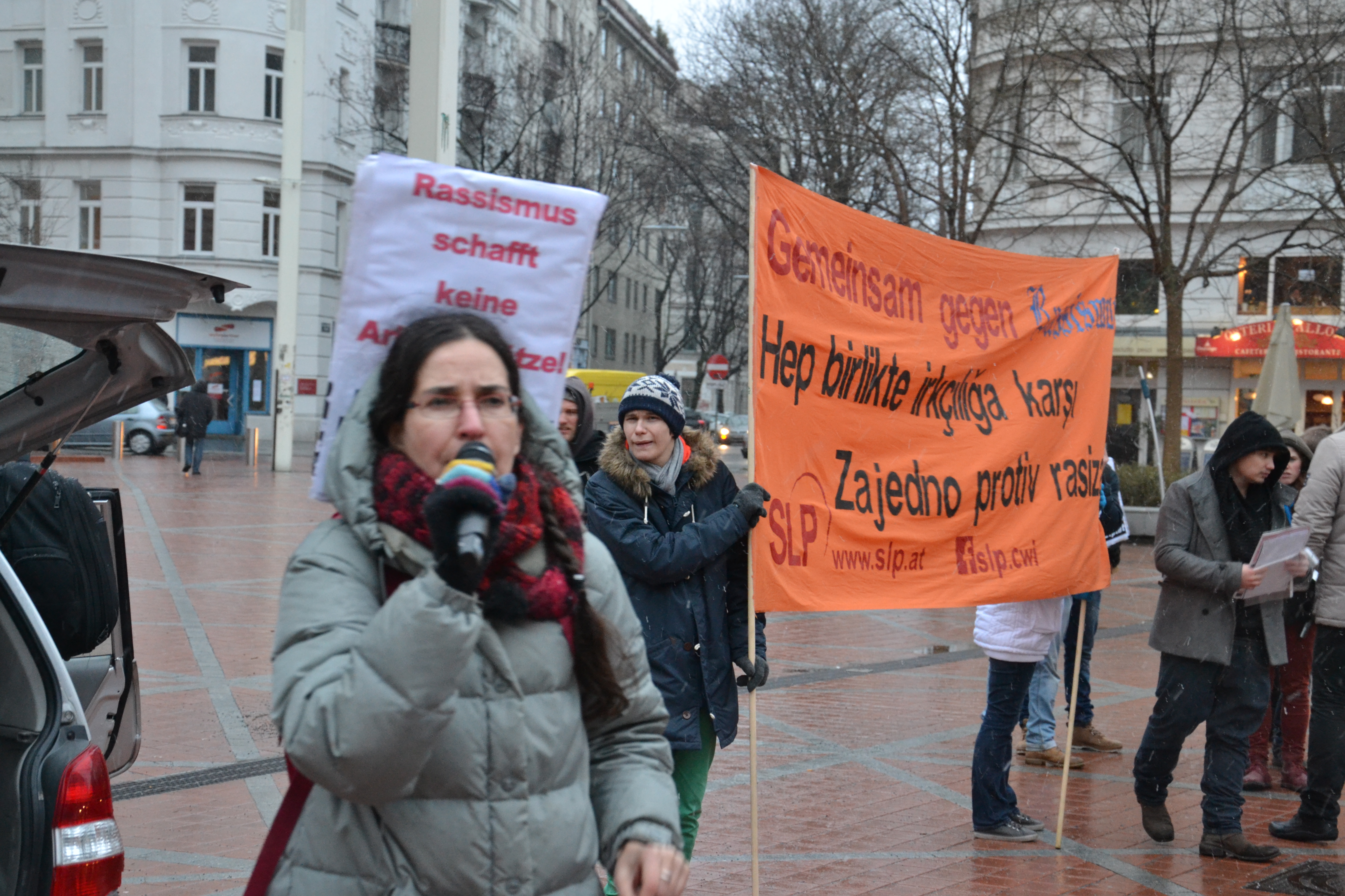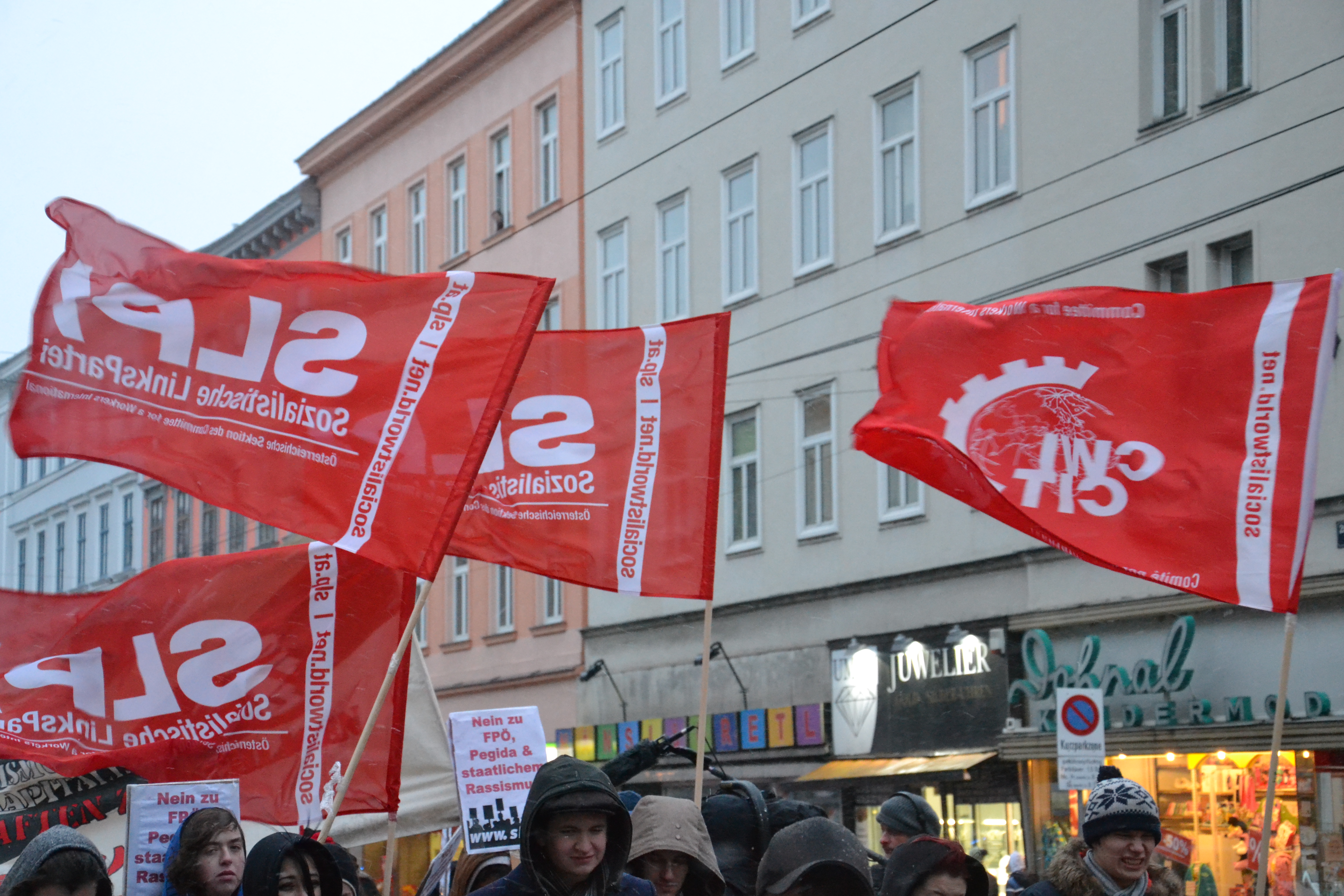 Gegen diesen Rechtswalzer zwischen rechten Hetzern und neoliberalen ArbeiterInnenfeinden organisierte die SLP in den letzten Wochen in einem der ärmsten Bezirke Wiens, der Brigittenau. Und so zog der Demonstrationszug der SLP ab 16.00 über die Wallensteinstrasse. Im Zentrum standen die massiven sozialen Probleme, die die rechten Hetzer für ihren Stimmenfang benützen. Doch nicht MigrantInnen sind schuld an Arbeitslosigkeit – es sind Kapitalisten, die Leute raushauen! Gerade die FPÖ hat in ihren Reihen Vertreter jener Immobilienspekulanten, die verantwortlich für hohe Mieten, befristete Verträge, horrende Ablösen und Kautionen und miese Wohnungen sind. Der Demonstrationszug der SLP stand daher unter dem Motto „Rassismus schafft keine Arbeitsplätze – Gemeinsam kämpfen für Jobs und höhere Löhne“. RednerInnen der SLP forderten eine Arbeitszeitverkürzung bei vollem Lohn, die Einführung eines Mindestlohnes von 1700.- und die Enteignung von SpekulantInnen. Doch auch die Regierungsparteien (in Bund und Land) haben Verantwortung für das Erstarken des Rechtsextremismus: seit über 10 Jahren werden in Wien keine Gemeindewohnungen mehr gebaut, ein wesentlicher Grund für die immer dramatischere Mietensituation in Wien. Der staatliche Rassismus setzt oft die Forderungen der FPÖ um und Frauen werden von den etablierten Parteien zwar theoretisch hofiert, aber praktisch sind sie besonders von der Kürzungspolitik der Regierungen betroffen. Die RednerInnen der SLP haben daher auch „10 Milliarden für Bildung und Soziales statt für Banken und Konzerne" gefordert sowie ein öffentliches Investitionsprogramm u.a. in Wohnen, öffentlichen Verkehr und Gesundheit. Volle soziale und demokratische Rechte für alle die hier leben ist ebenfalls eine zentrale Forderung der SLP.