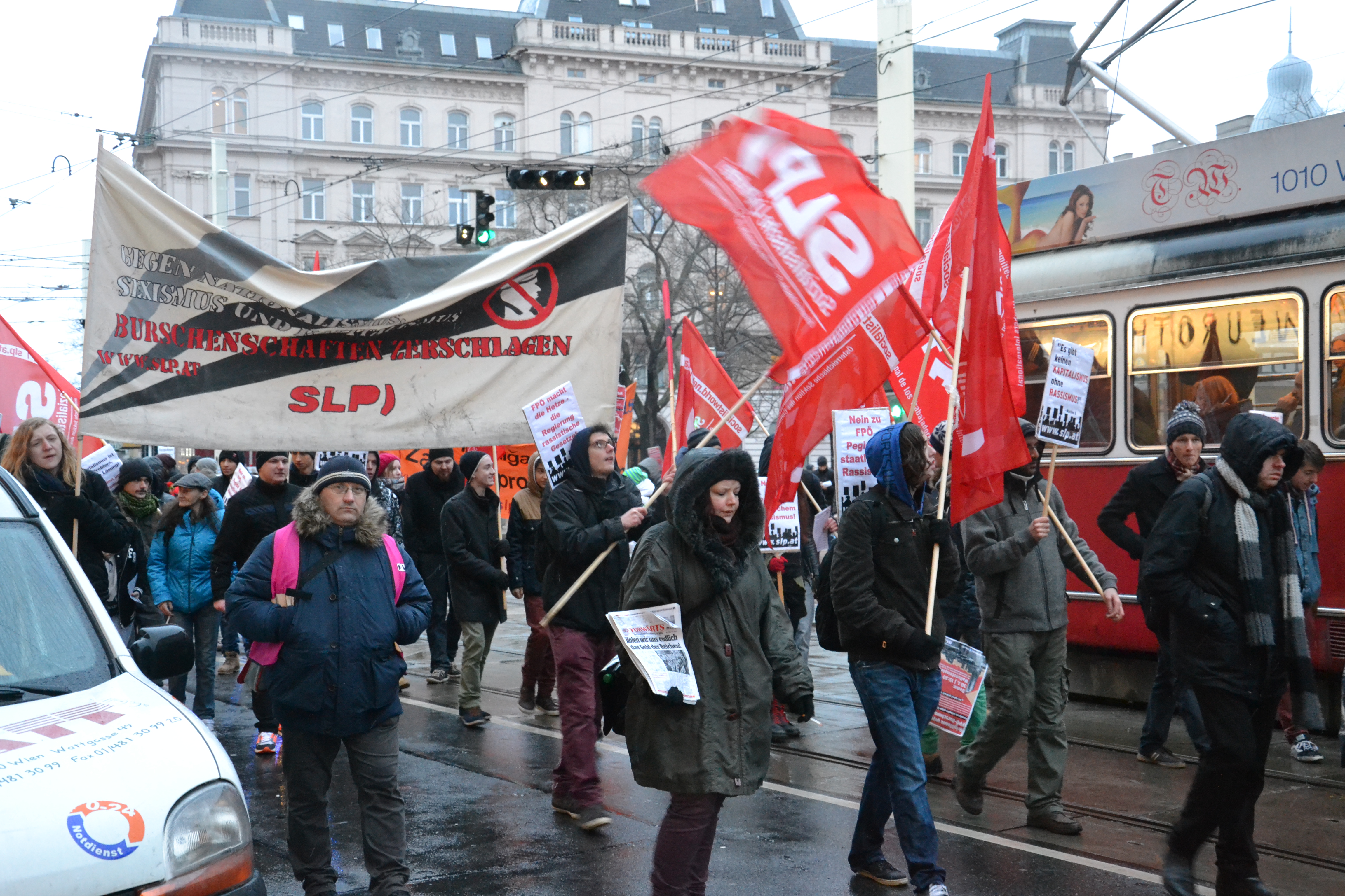 Die Demonstration der SLP lies sich durch die Polizeiaggression nicht einschüchtern und zog lautstark weiter zum Schottentor, wo ein lauter SLP-Block in der OGR-Demonstration bis zum Stephansplatz zog. Als Teil der Offensive gegen Rechts beteiligte sich die SLP auch an den „Blockaden“, also Kundgebungen in der Wiener Innenstadt. Von den DemonstrantInnen wurden einige Taxis mit „Ball“Gästen daran gehindert, ihr Ziel zu erreichen – gut so. Doch vollständig verhindert kann dieses Treffen der Rechten so nicht. Eine effektive Blockade wird durch eine Massenmobilisierung erreicht. Die SLP hat in Wien 20 gezeigt, wie der Protest gegen die rechten Hetzer und ihr neoliberales Programm in die Bezirke getragen werden kann. Ein gutes Modell für 2016 – 22 Demonstrationszüge, die aus ganz Wien zum Ring marschieren, wo GewerkschafterInnen, Arbeitslose, MigrantInnen, Studierende, SchülerInnen & Co. deutlich zeigen, dass sie bereit sind dem „Akademikerball“ entgegenzutreten wäre eine neue Qualität, die viel schwerer kriminalisiert und diffamiert werden kann. Die mit einer Massenbewegung im Vorfeld und echten Massenblockaden am Tag selbst dieses rechte Treffen endgültig verhindern könnte. So kann auch eine Massenbewegung aufgebaut werden, die nicht nur dieses eine rechtextreme Treffen, sondern den Aufstieg des Rechtsextremismus insgesamt ausbremsen kann.