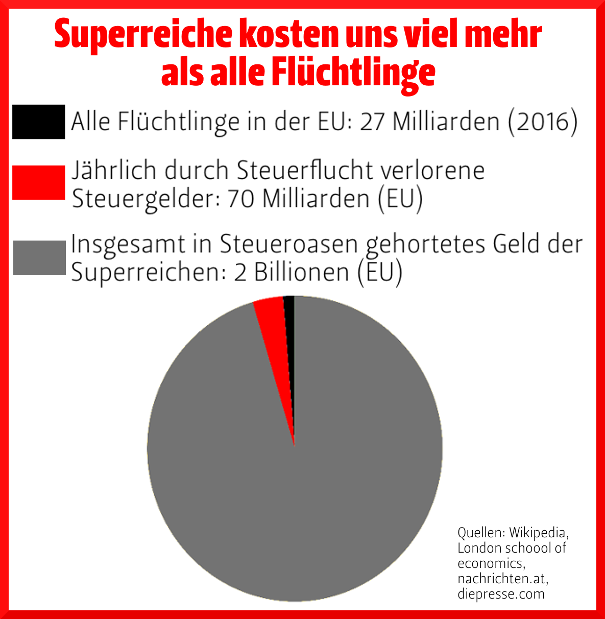 Kriege, Hunger und Umweltkatastrophen sind die Hauptursachen für Flucht. Aktuell gibt es über 30 registrierte Kriege und Konfliktherde, die dazu führen, dass Menschen die Region verlassen müssen, um ihr Leben und das ihrer Kinder zu retten. Allein 2015 verkauften deutsche Rüstungsfirmen Waffen im Wert von fast fünf Milliarden Euro ins Ausland. Österreich erstellt seit 2010 keinen Bericht mehr darüber, welche Firmen Waffen wohin verkaufen. Doch wird offensichtlich an diverse Diktaturen und real kriegführende Staaten verkauft.