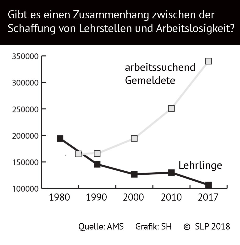 Sinkende Lehrlingszahlen: 2005 gab es noch 122.378 Lehrlinge, 2017 nur noch 106.613. Außerdem arbeiten und lernen immer mehr Lehrlinge nicht mehr in Betrieben, sondern in der überbetrieblichen Ausbildung: Von 2007 bis 2017 hat sich die Anzahl von Jugendlichen in dieser überbetrieblichen Ausbildung auf 9.101 verdreifacht – jedeR 11. Lehrling lernt nicht mehr im Betrieb. Innerhalb eines Jahrzehntes (2007-17) ist die Anzahl der Lehrbetriebe um ein Viertel oder mehr als 10.000 Lehrbetriebe gesunken.